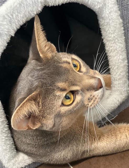 A welcome newcommer to our cattery. Lovelly gentle boy, adorable green eyes and the most admarable personality, Fur is short, shiny and dense. Lovelly groundcolour and even ticking. We look forward to bringing him into our breeding programme. A playful male great in size, long legs and tail.